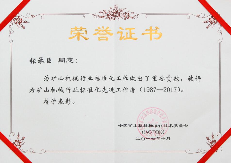 董事長張承臣榮獲“礦山機械行業標準化先進工作者”稱號