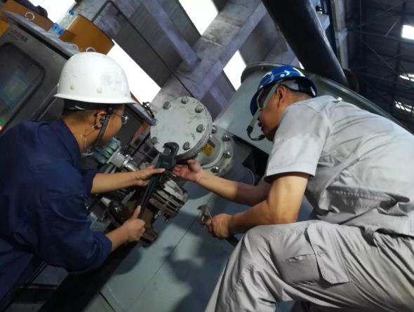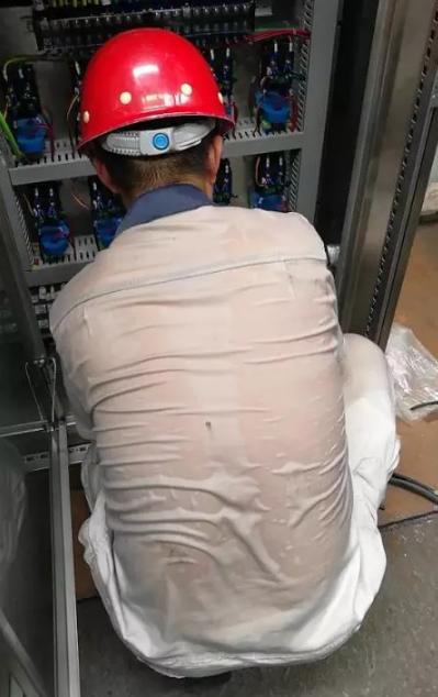 高強度工作的同時,大家還要接受高溫的“烤”驗。9月雖已入秋,但廠房內仍能達到40度以上,與廠房其他區域相比,在設備運行區域的隆基工作人員要忍受更高的溫度。因為這個區域緊挨礦渣輸送區域,礦渣經過煉制會釋放大量熱量,同時,周圍設備數量眾多,熱源非常多,使得這個區域的溫度要更高,作業環境也更為惡劣。大家被這樣的高溫包圍,三天里,每天的衣服都是濕了又干,干了又濕,衣服時刻在變換著顏色,灰色變成深灰色再變成灰色,最后形成“白色地圖”。