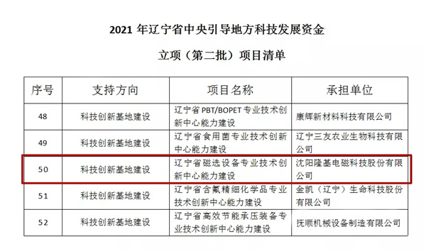 近日,隆基電磁“遼寧省磁選設備專業(yè)技術創(chuàng)新中心能力建設”項目成功入選“遼寧省2021年中央引導地方科技發(fā)展資金立項(第二批)項目”。